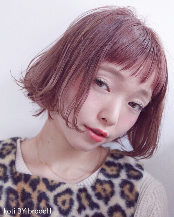 ブリーチしてからのピンクベージュカラー☆短めベイビーバングの切りっぱなしボブ★ツヤ感のあるスタイリングとハネ感でガーリーなエッセンスを!シースルーなバングがかわいい!