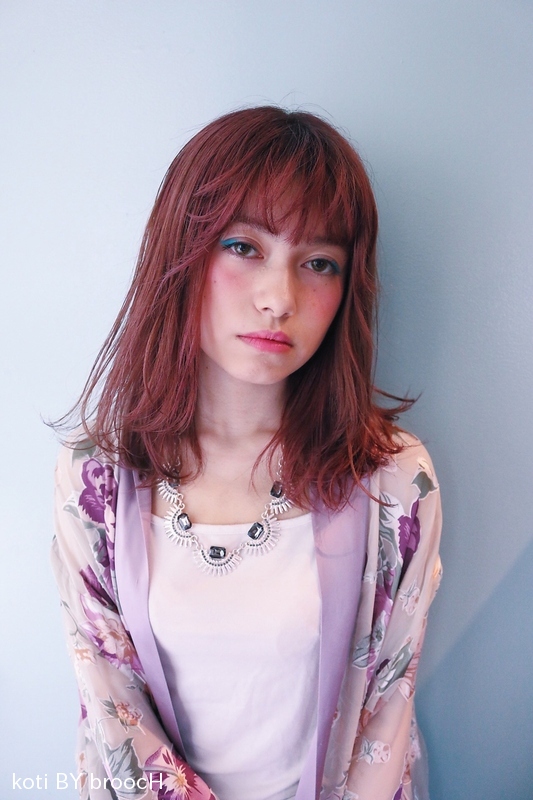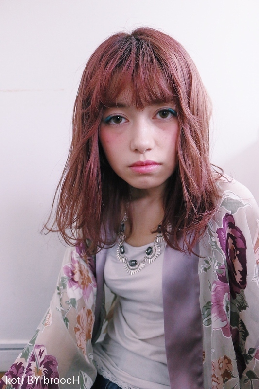 原宿 koti BY broocH シャーベットピンクカラー 70's ミディアムヘア☆ シースルーカラー ハネ感 ハイトーンカラー ツヤ感 ストレートヘア スタイリング簡単 シースルーバング