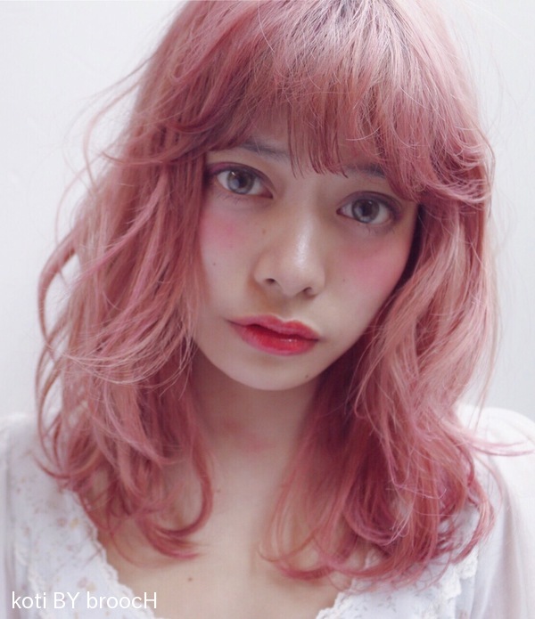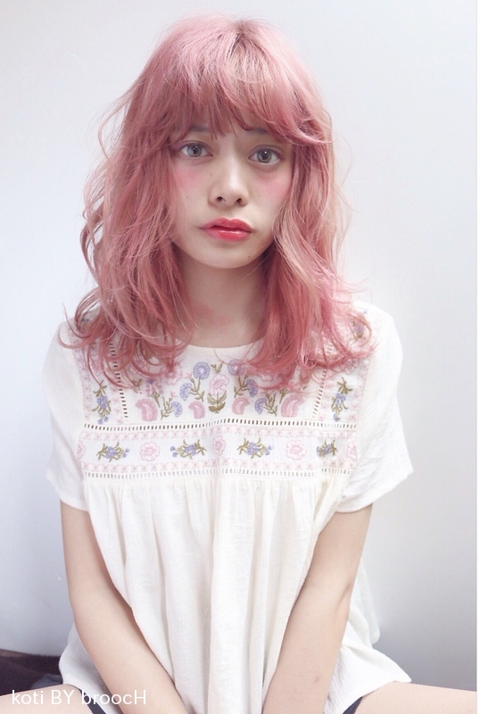 シャーベットピンクカラー スウィートミディ☆シースルーカラー ウェーブ ラフ 毛先のハネ感 シースルーバング 70s おフェロ 外国人風